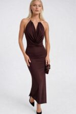 Aksesuar Detaylı Degaje Yaka Kahverengi Maxi Elbise
