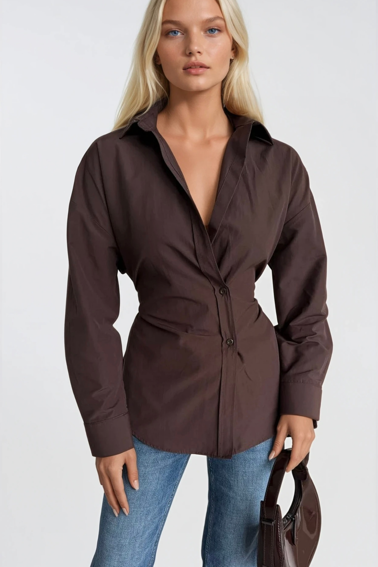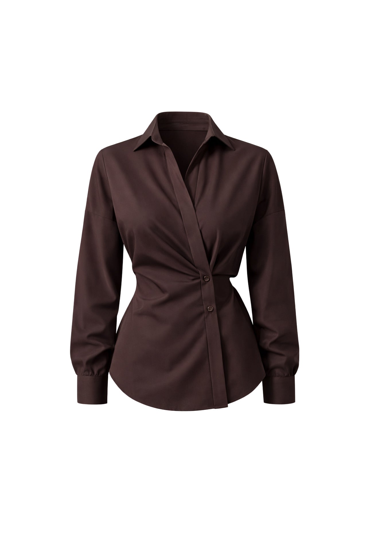 Asimetrik Düğme Detay Bel Oturtmalı Kahverengi Gömlek