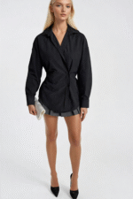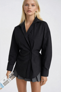 Gücün ve Zarafetin Kesişim NoktasıSiyahın zamansız otoritesini asimetrik bir tasar ım diliyle buluşturan bu gömlek, her ortamda fark yaratan bir duruş sunuyor. Bel oturtmalı kesimi ile silüeti belirginleştirirken asimetrik düğme detayı modern bir karakter katıyor.Tasarım Detayları Asimetrik düğme kapama detayı Bel oturtmalı, vücut hatlarını öne çıkaran kesim Derin siyah renk — güçlü, sofistike ve çok yönlü XS’ten L’ye kadar beden seçeneği Nasıl Kombinlenir?Yüksek belli bir pantolon ile ofisten akşam yemeğine taşıyın; ya da beyaz bir blazer ile kontrast bir denge kurun. Siyahın sonsuz uyumuyla her kombinasyonda öne çıkan bir parça.Ürün Kodu: 52118011