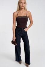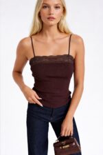 Askılı Dantel Detay Kahverengi Triko Bluz