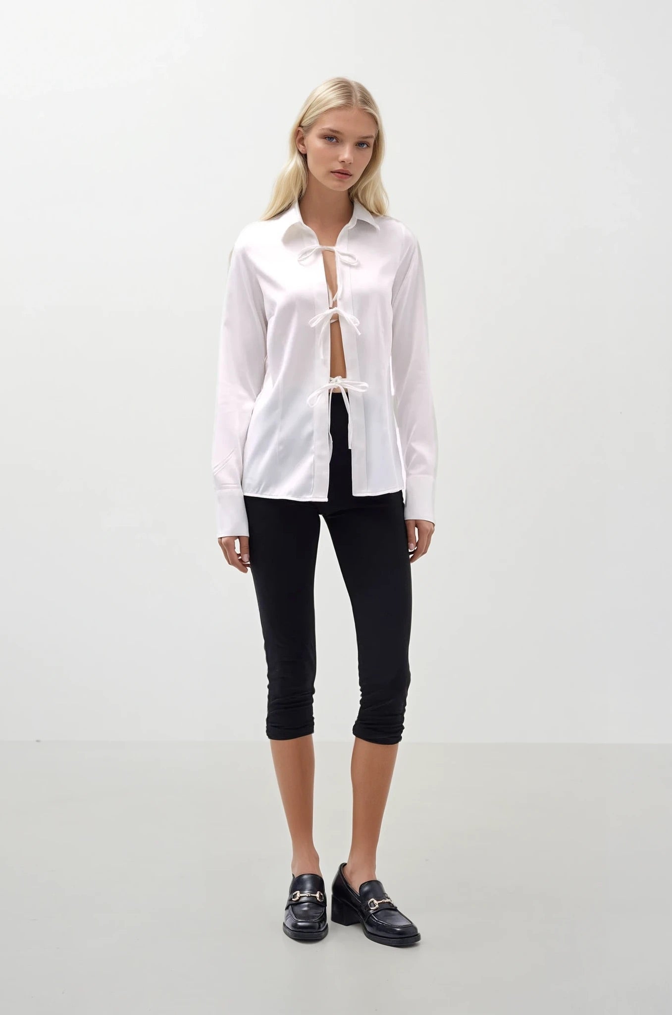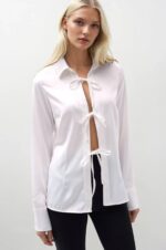 Önü Fiyonk Detaylı, Saten Dokuma Kumaş, Düğmesiz, Manşetli Gömlek Manken Ölçüleri : Göğüs : 80 cm Bel : 61 cm Basen : 90 cm Manken Boy : 176 cm Kilo : 53 kg Manken üzerindeki S bedendir. Ürün İçeriği : 100 Polyester Ürün Kodu : 52218012