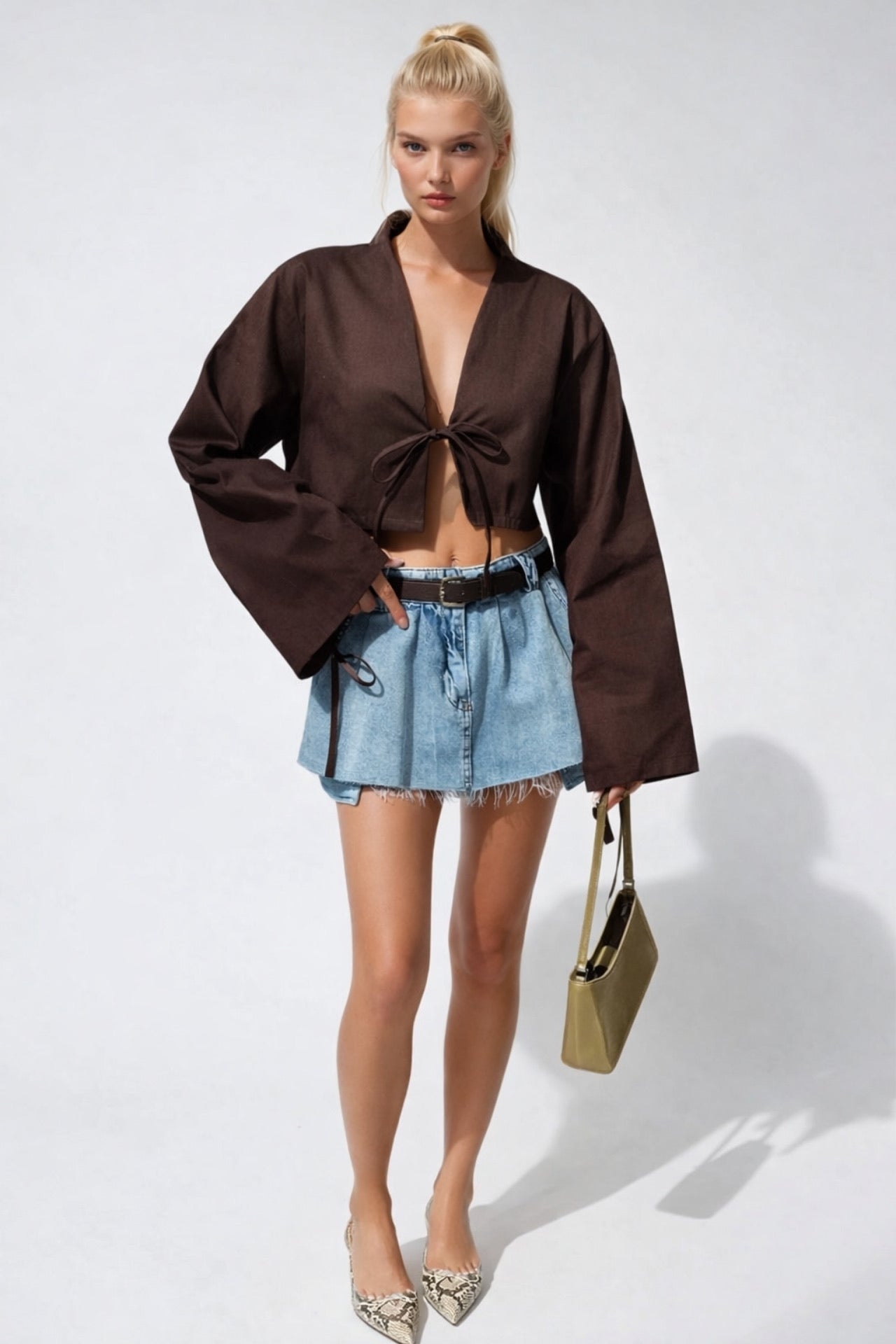 Bağlama Detay Uzun Kol Kahverengi Bluz