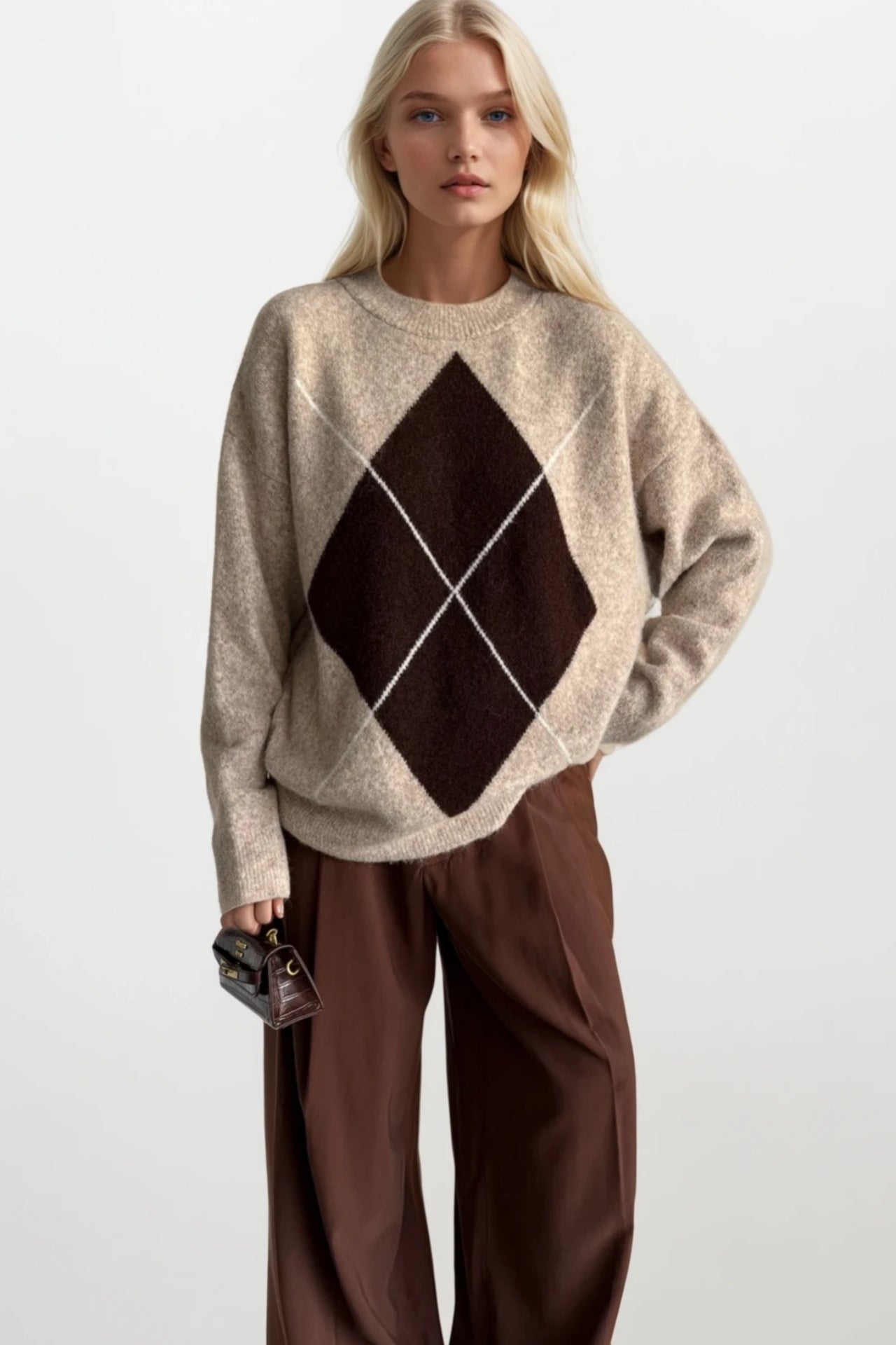 Baklava Desen Bisiklet Yaka Bej Triko Kazak