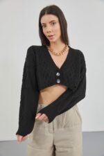 Baklava Desen Siyah Crop Saçaklı Hırka