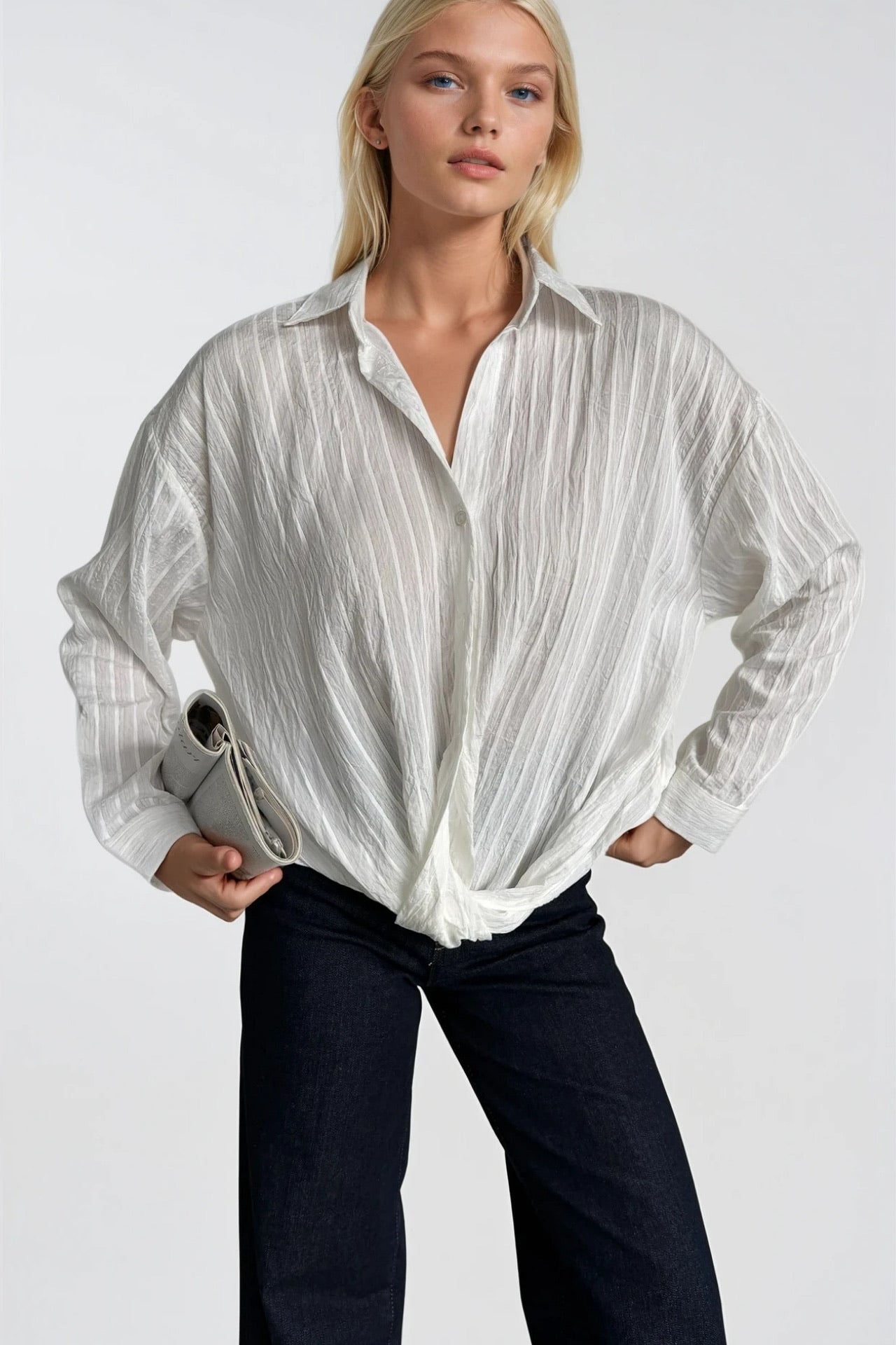 Bel Büzgülü Dokulu Beyaz Modal Gömlek