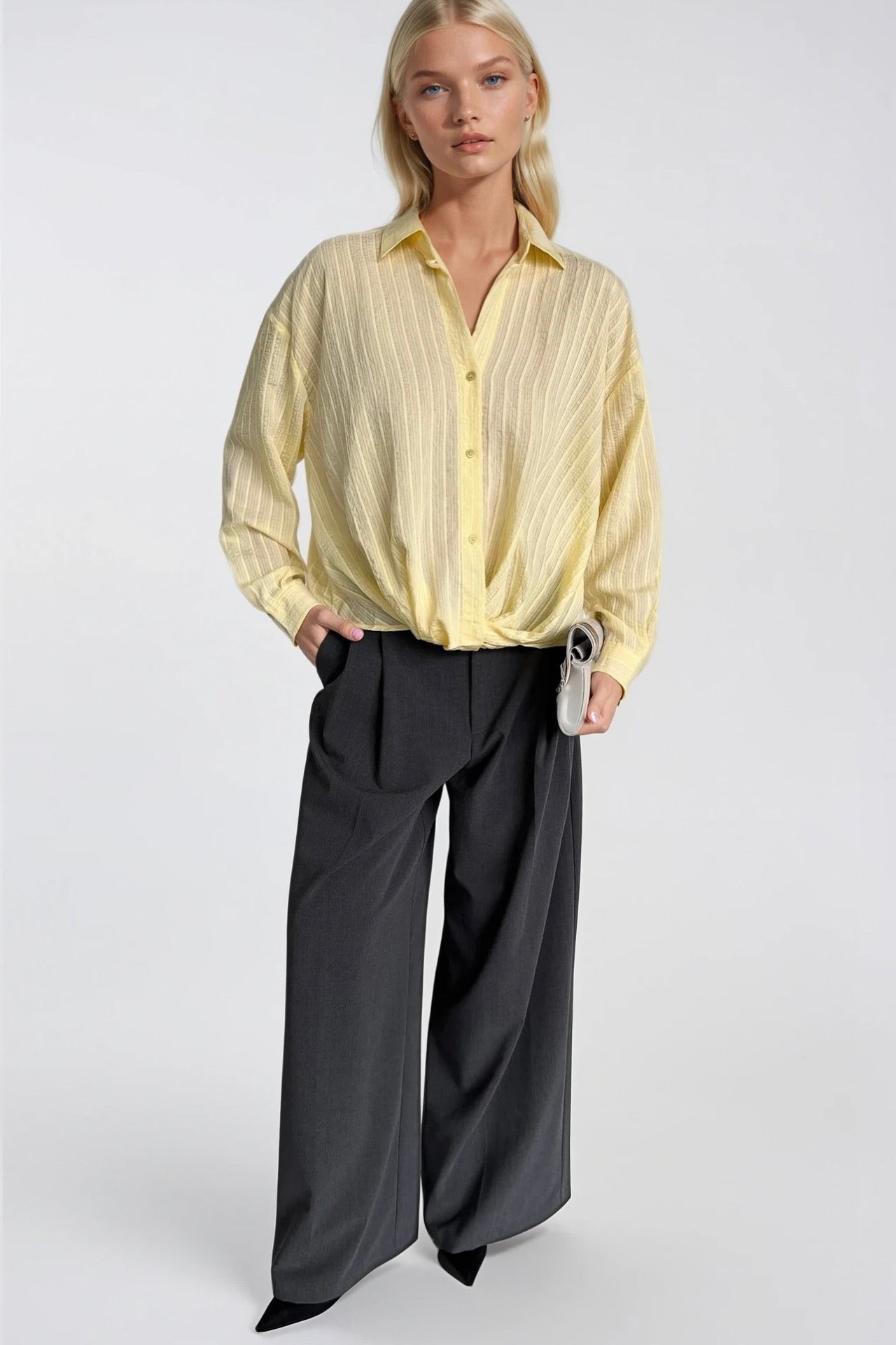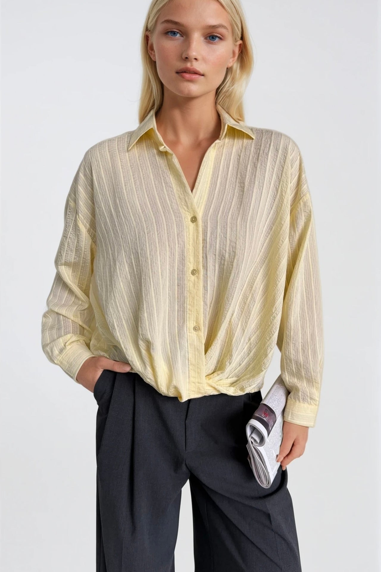 Canlı renk paleti, premium modal dokusuyla buluşuyor. Bel büzgülü dokulu sarı modal gömlek, gardırobunuza ışık ve sofistike bir karakter katıyor. Tasarım Detayları Bel bölgesinde özel büzgü detayı ile feminen ve şık siluet Dokulu kumaş yapısı ile zengin ve premium görünüm Premium kalite modal kumaş; nefes alır, yumuşak ve konforlu Canlı sarı tonu ile enerjik ve sofistike renk paleti Dayanıklı dikiş detayları ile uzun ömürlü kullanım S, M, L beden seçenekleri Stil Önerileri Yüksek bel pantolon veya etek ile sofistike kombinler yaratın. Denim ile casual şıklık, akşam davetleri için ise şık bir etek ile tamamlayın. Canlı sarı tonu, nötr renklerle mükemmel uyum sağlar ve kombinlerinize pozitif bir enerji katar. Kumaş ve Bakım Premium modal kumaşın özel yapısı sayesinde nefes alır ve uzun ömürlü kullanım. Modalın yumuşaklığını ve renk canlılığını korumak için hassas yıkama programı önerilir, düz sererek kurutun. Ürün Kodu: 52118015