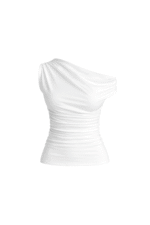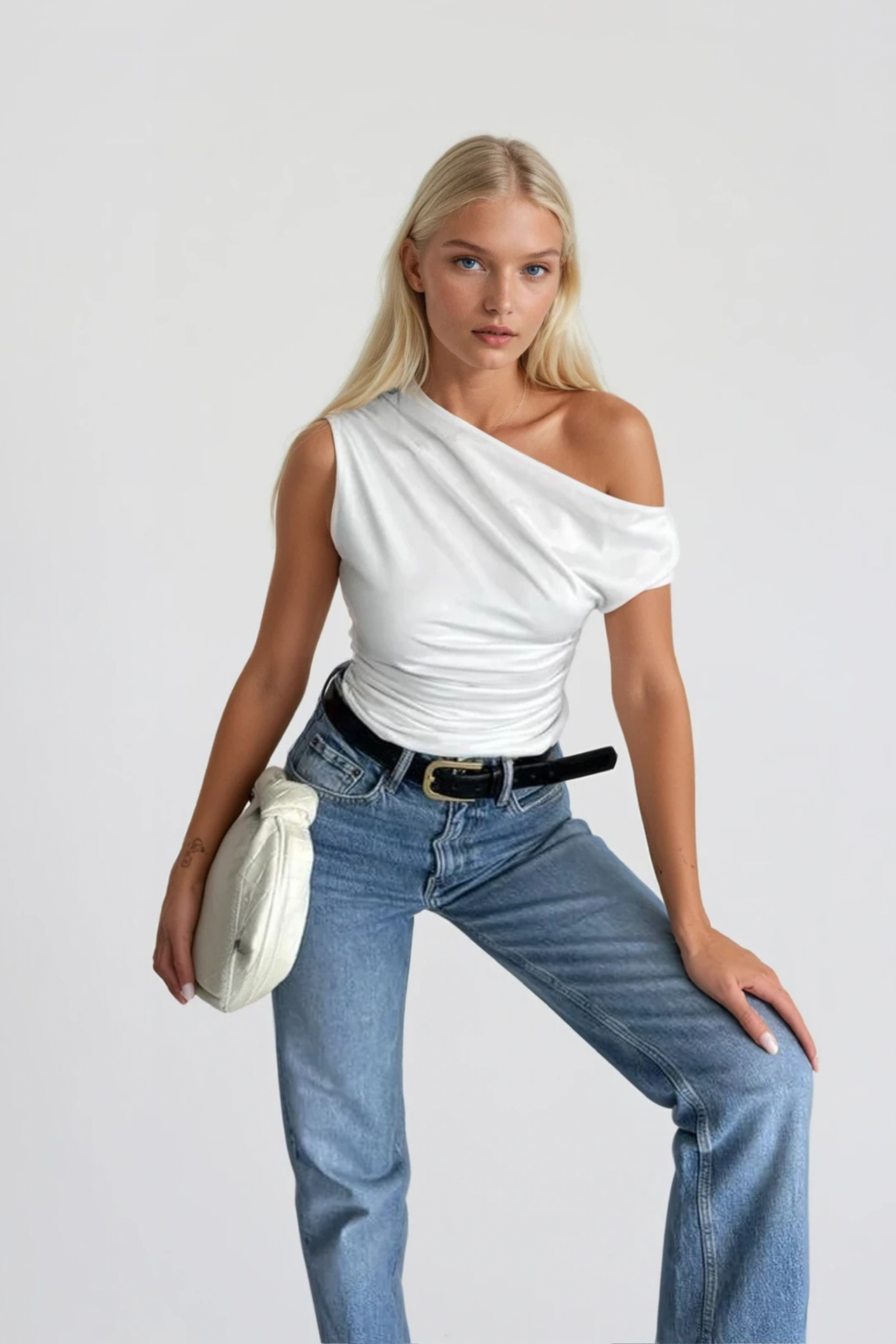 Bel Oturtmalı Asimetrik Omuz Detay Beyaz Bluz