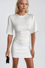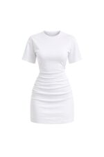 Bel Oturtmalı Büzgülü Beyaz Mini Elbise