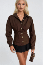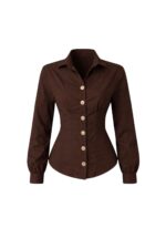 Bel Oturtmalı Gold Düğmeli Kahverengi Gömlek