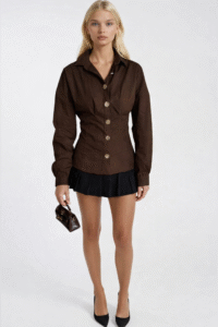 Toprağın Sıcaklığı, Gold’un ZarafetiKahverengi tonların doğal sıcaklığını gold düğme detayının ışıltısıyla buluşturan bu gömlek, toprak paletinin en sofistike yorumunu sunuyor. Bel oturtmalı kesimi silüeti belirginleştirirken elastan içerikli kumaşı gün boyu konfor ve hareket özgürlüğü sağlıyor.Tasarım Detayları Gold düğme kapama detayı — toprak tonlarını ışıltıyla taçlandıran aksesuar etkisi Bel oturtmalı kesim — vücut hatlarını öne çıkaran silüet %90 Polyester, %10 Elastan — esnek, hafif ve şekil koruyan kumaş Sıcak kahverengi ton — doğal, sofistike ve çok yönlü XS’ten L’ye kadar beden seçeneği Nasıl Kombinlenir?Krem ya da bej tonlu bir pantolon ile toprak paleti üzerinden bütünlüklü bir görünüm elde edin; ya da siyah dar paça ile gold detayı öne çıkarın. Sonbahar ve ilkbahar gardrobunun en çok başvurulan parçalarından biri olmaya aday.Ürün Kodu: 52118007