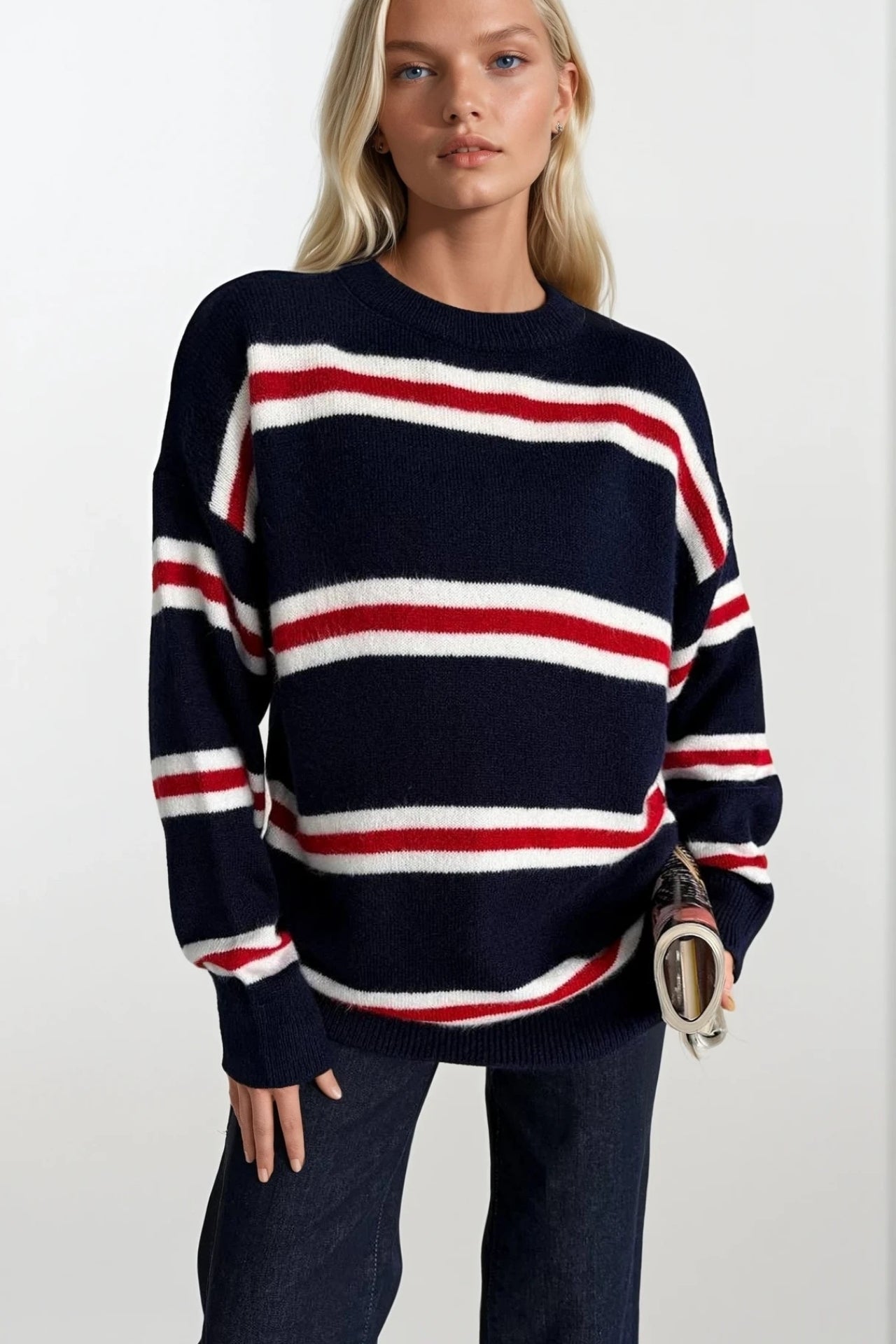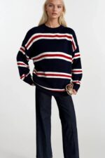Bisiklet Yaka Çizgili Lacivert Triko Kazak
