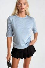 Biye Detay Bisiklet Yaka Mavi Triko Bluz