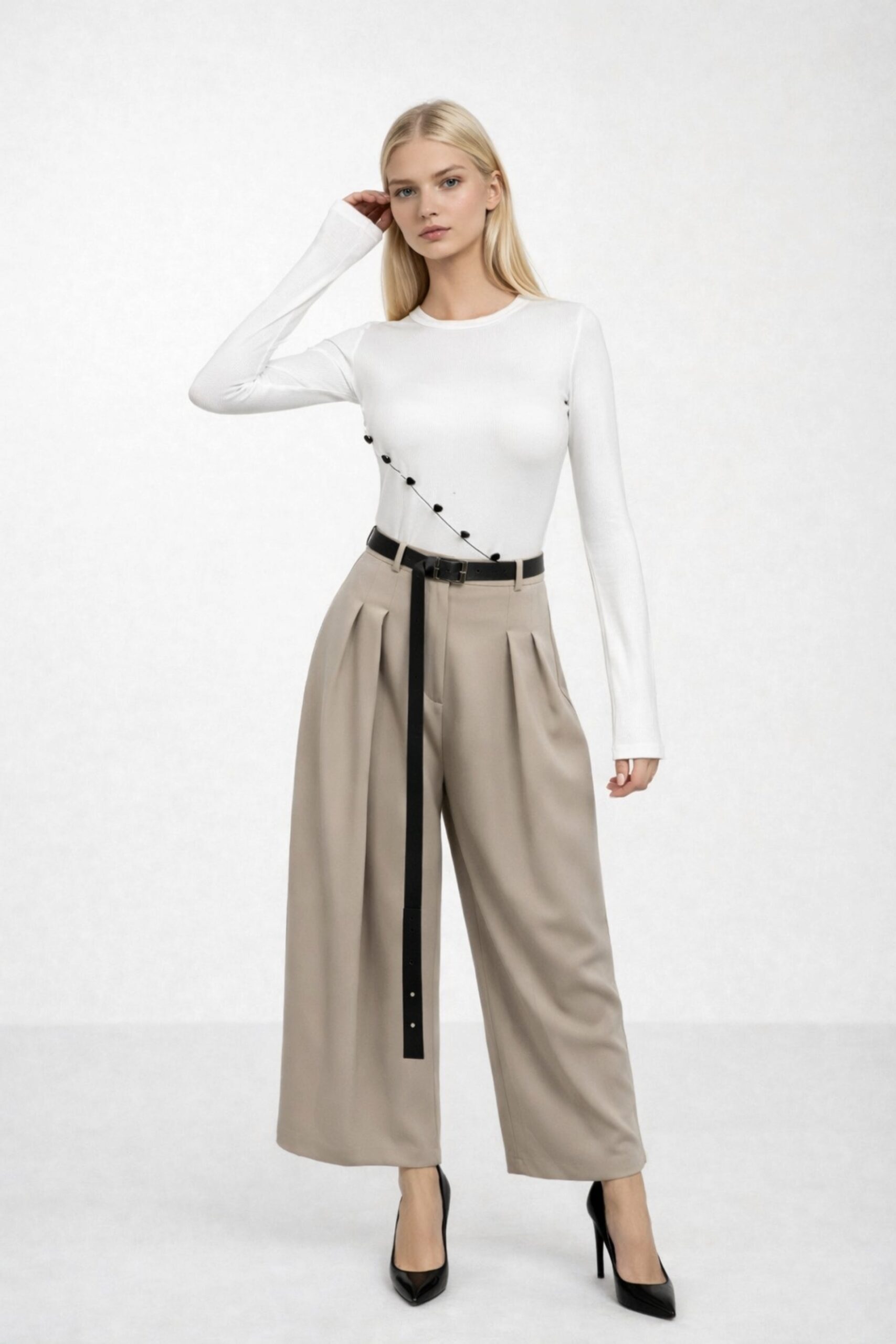 Buton asimetrik i detajuar, me mëngë të gjata, bluzë Dimensionet e modelit: Gjoks: 89 cm Beli: 68 cm Ijet: 95 cm Lartësia e manekinit: 177 cm Pesha: 57 kg Është madhësia M në manekin. Përmbajtja e produktit: 90 Polyester 10 Elestan Kodi i produktit: 23W15010