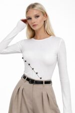 Bluzë e bardhë me mëngë të gjata me detaj me buton asimetrik