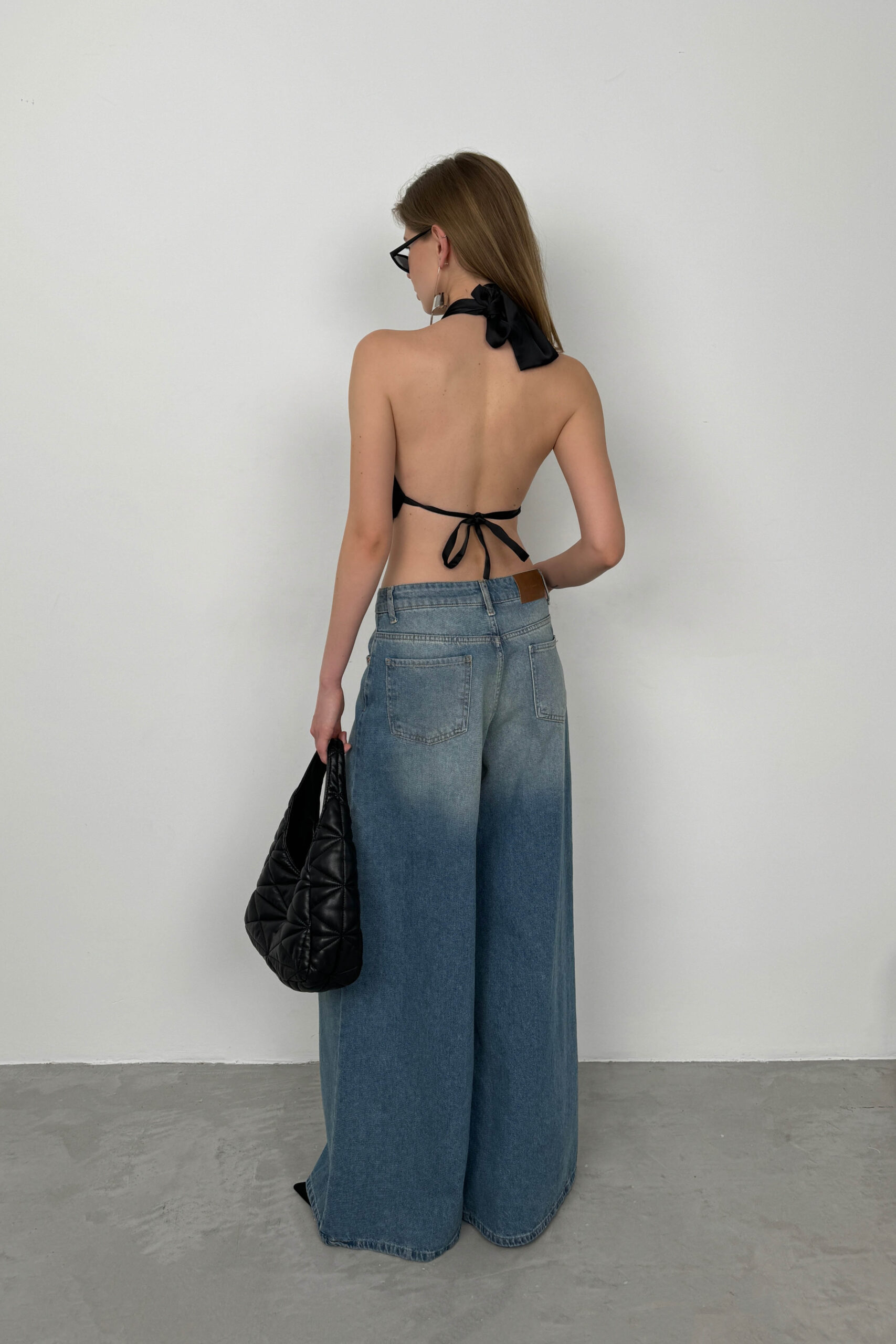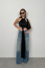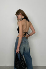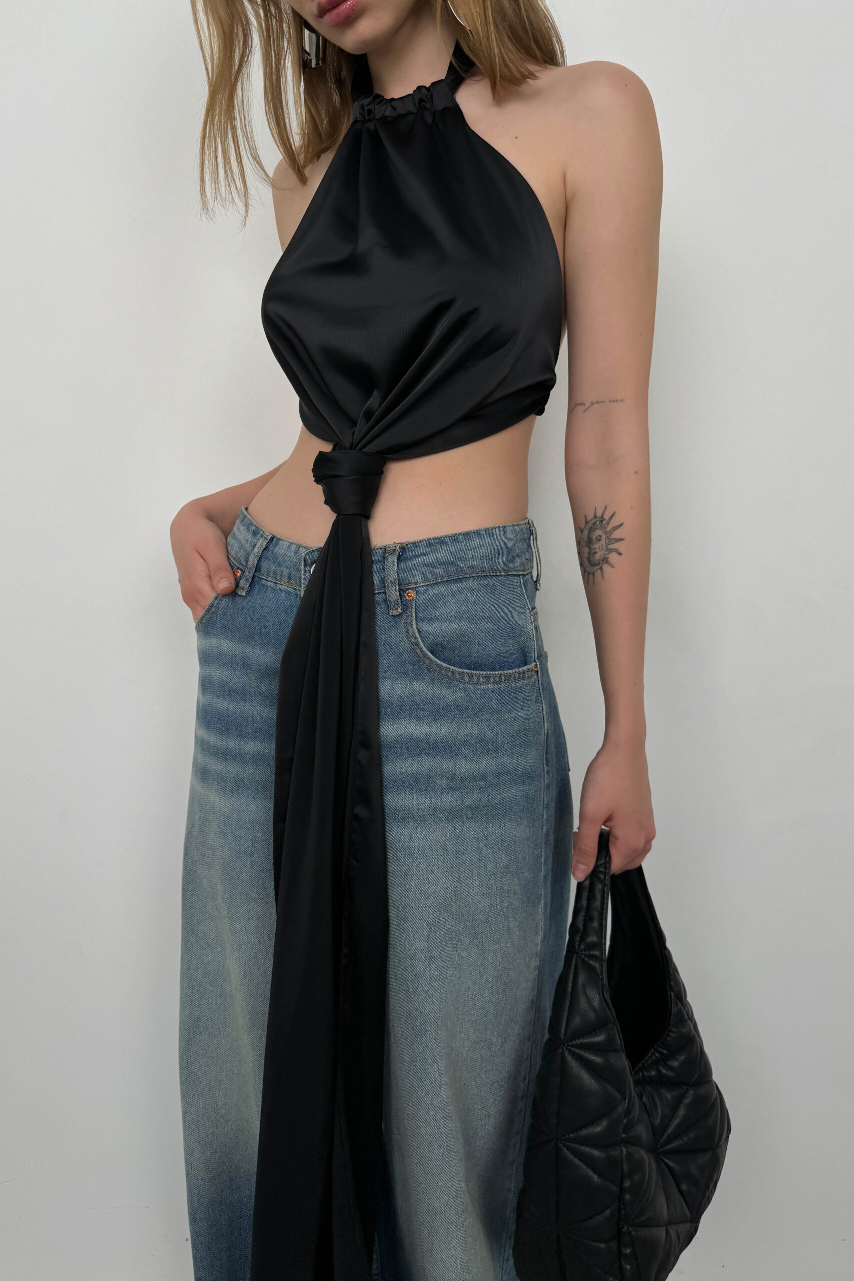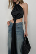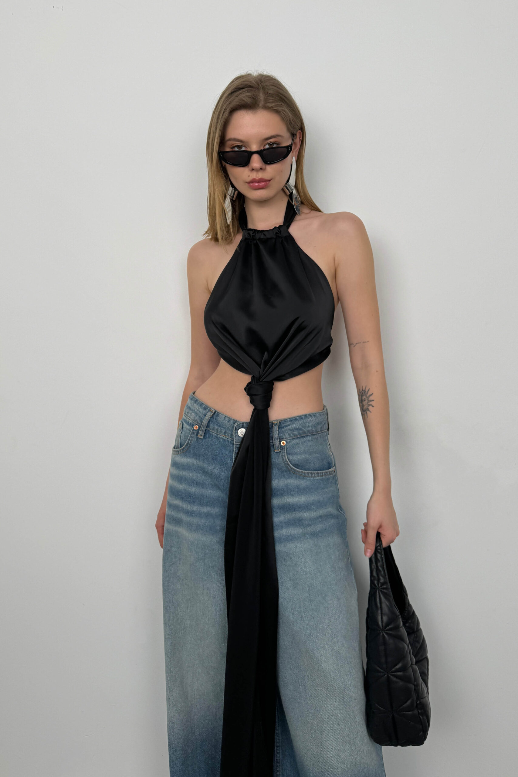 Kravatë e përparme, e pasme me prerje të ulët, kravatë qafe, pa mëngë, pëlhurë saten, bluzë Përmasat e modelit: Gjoks: 85 cm Beli: 62 cm Ijet: 91 cm Lartësia e manekinit: 173 cm Pesha: 50 kg Është madhësia S në manekin. Përmbajtja e produktit: 100 poliestër Kodi i produktit: 24S15056