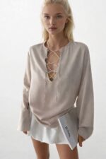 V-Qafë, Mëngë të gjata, Dantella, Bluzë liri, Mëngë të gjata, Mëngë spanjolle, Madhësia normale Modeli Dimensionet: Busti: 85 cm Beli: 62 cm Ijet: 91 cm Lartësia e modelit: 173 cm Pesha: 50 kg Është madhësia S në manekin. Përmbajtja e produktit: 85 Pambuk 15 Liri Kodi i produktit: 23S15016