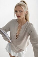 Bluzë ekru me prerje të ulët me qafë V