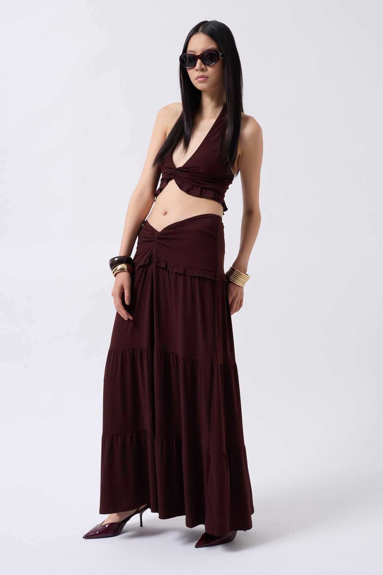 Büzgü Detay Asimetrik Bel Kahverengi Etek