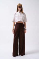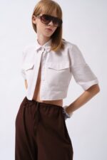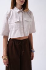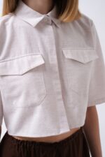 Këmishë Crop prej Liri në gri, me mëngë të gjysmë dhe detaj xhepi