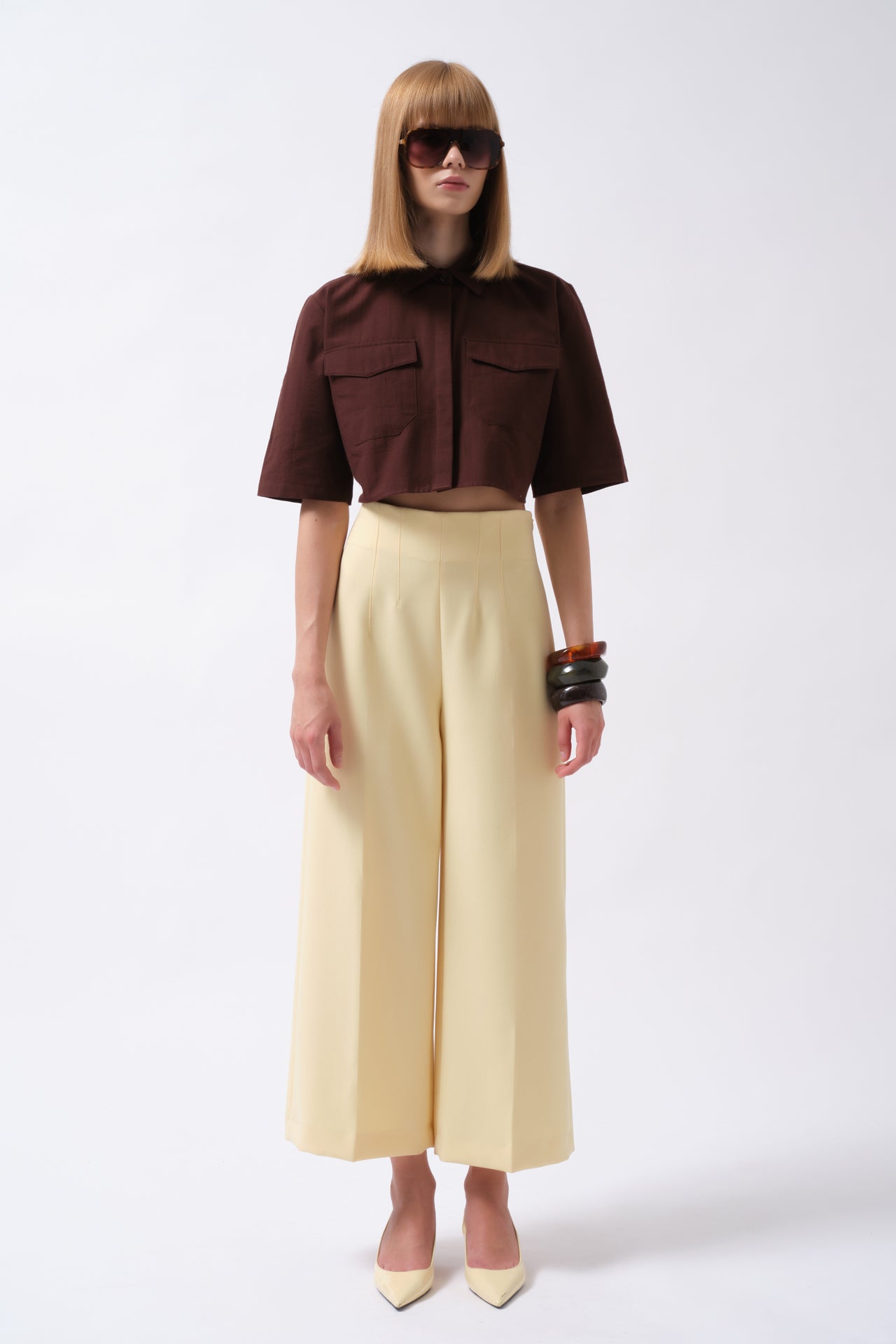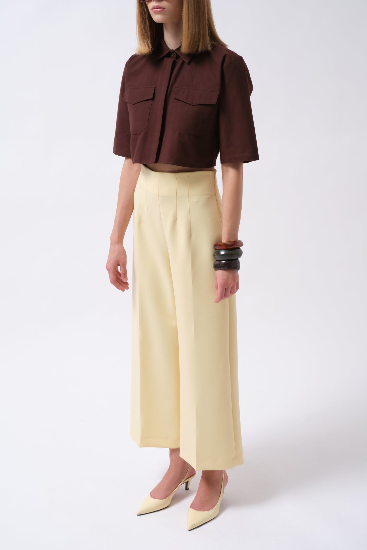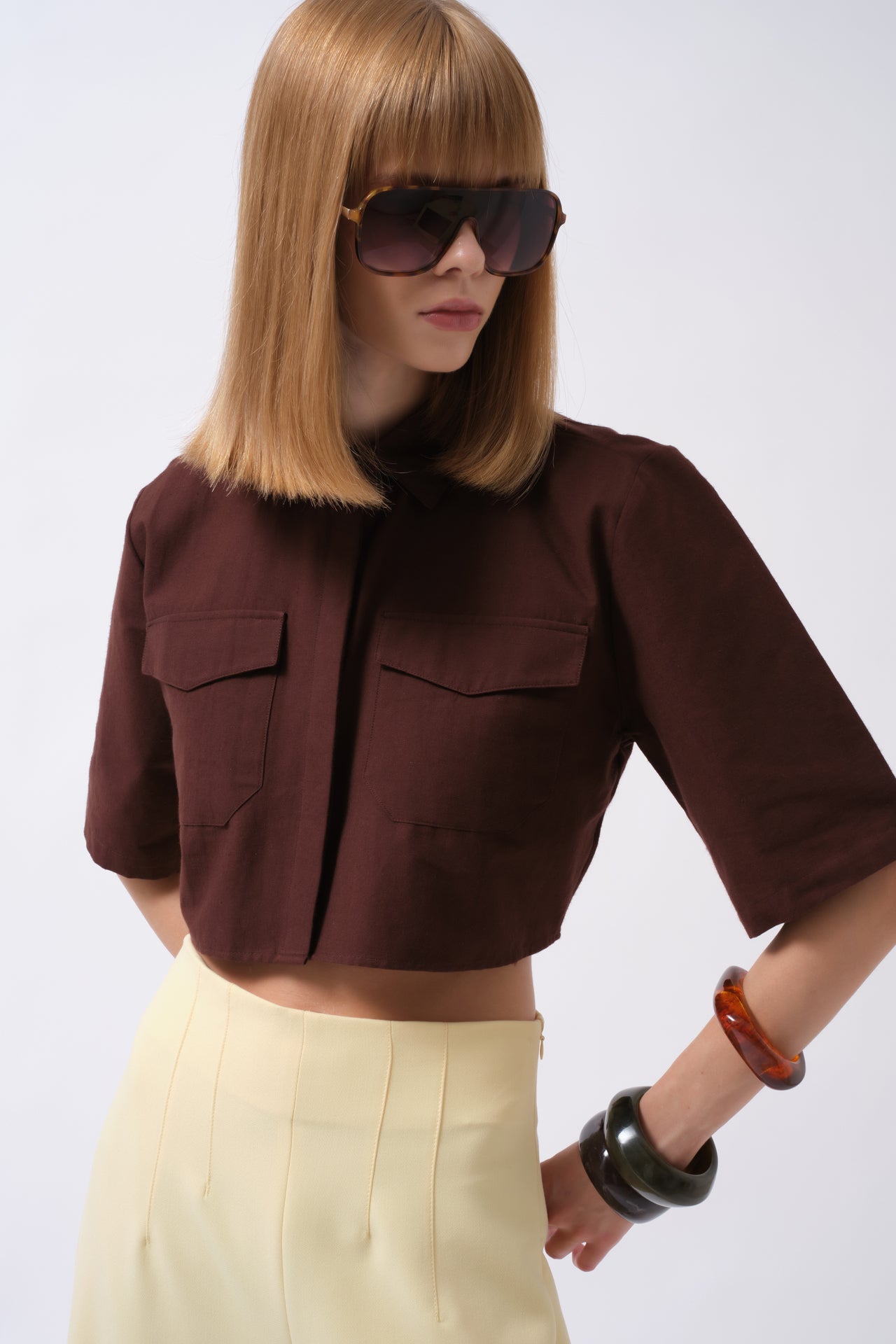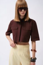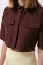 Këmishë Crop prej Liri në ngjyrë kafe, me mëngë të gjysmë dhe detaj xhepi