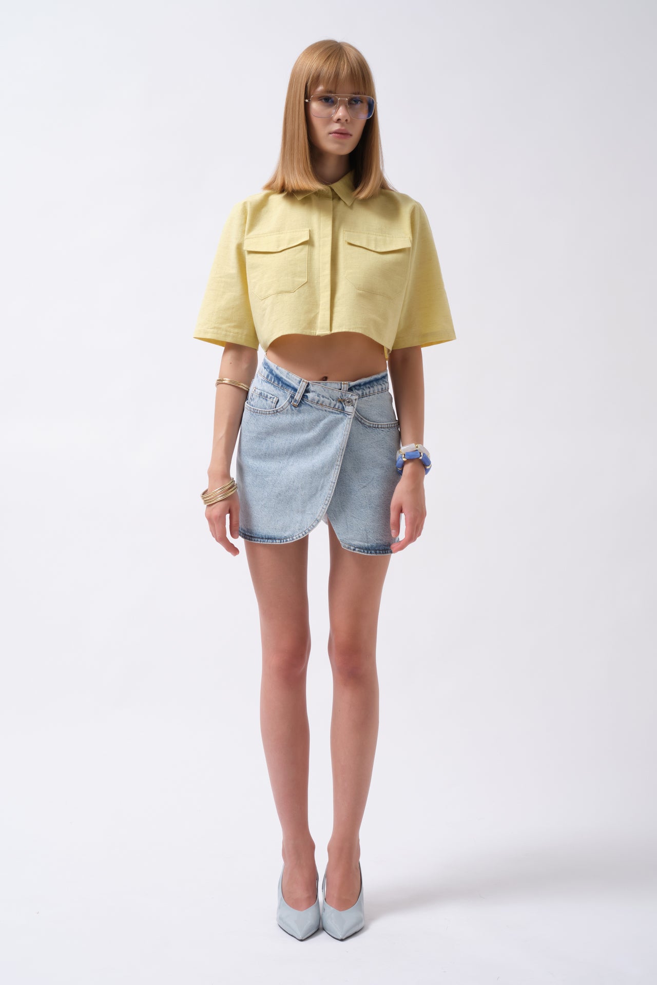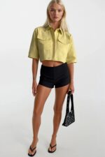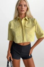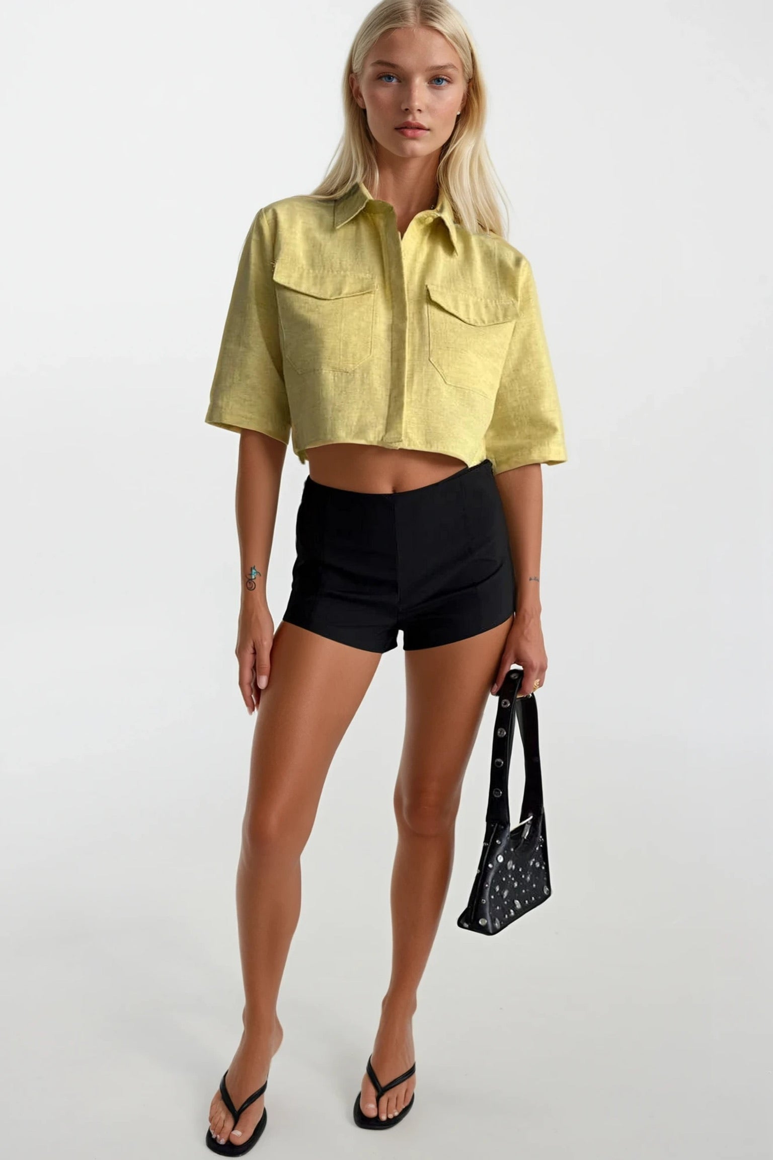 Këmishë Crop prej Liri në të Verdhë, me Detaj Xhepi dhe Mëngë të Gjysma