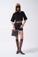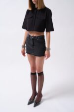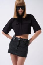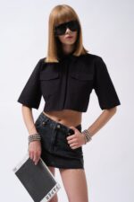 Këmishë Crop prej Liri në të Zezë, me Detaj Xhepi dhe Mëngë të Gjysma