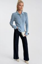 Çıtçıt Detay Polo Yaka Mavi Triko Bluz