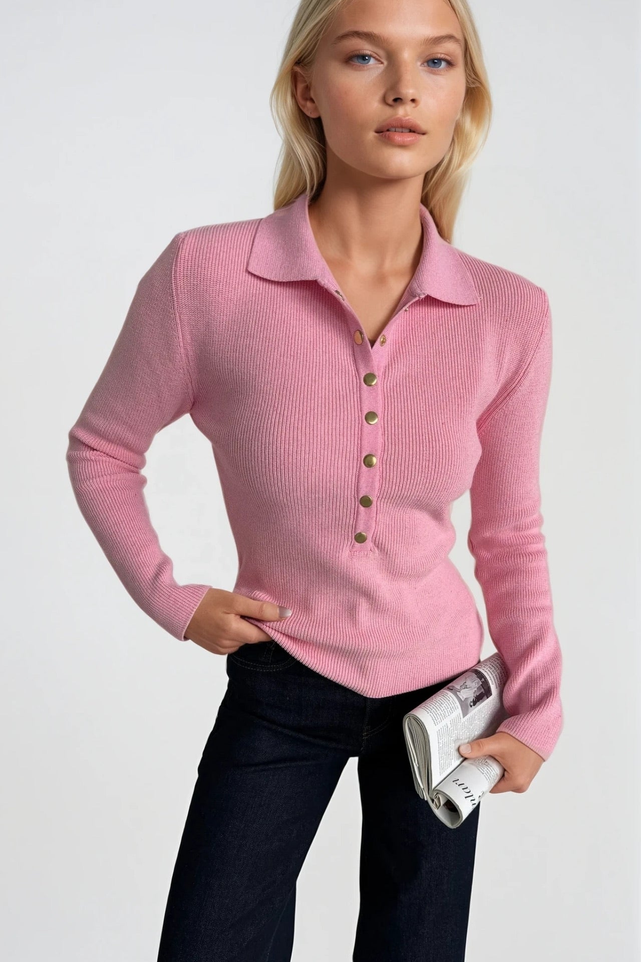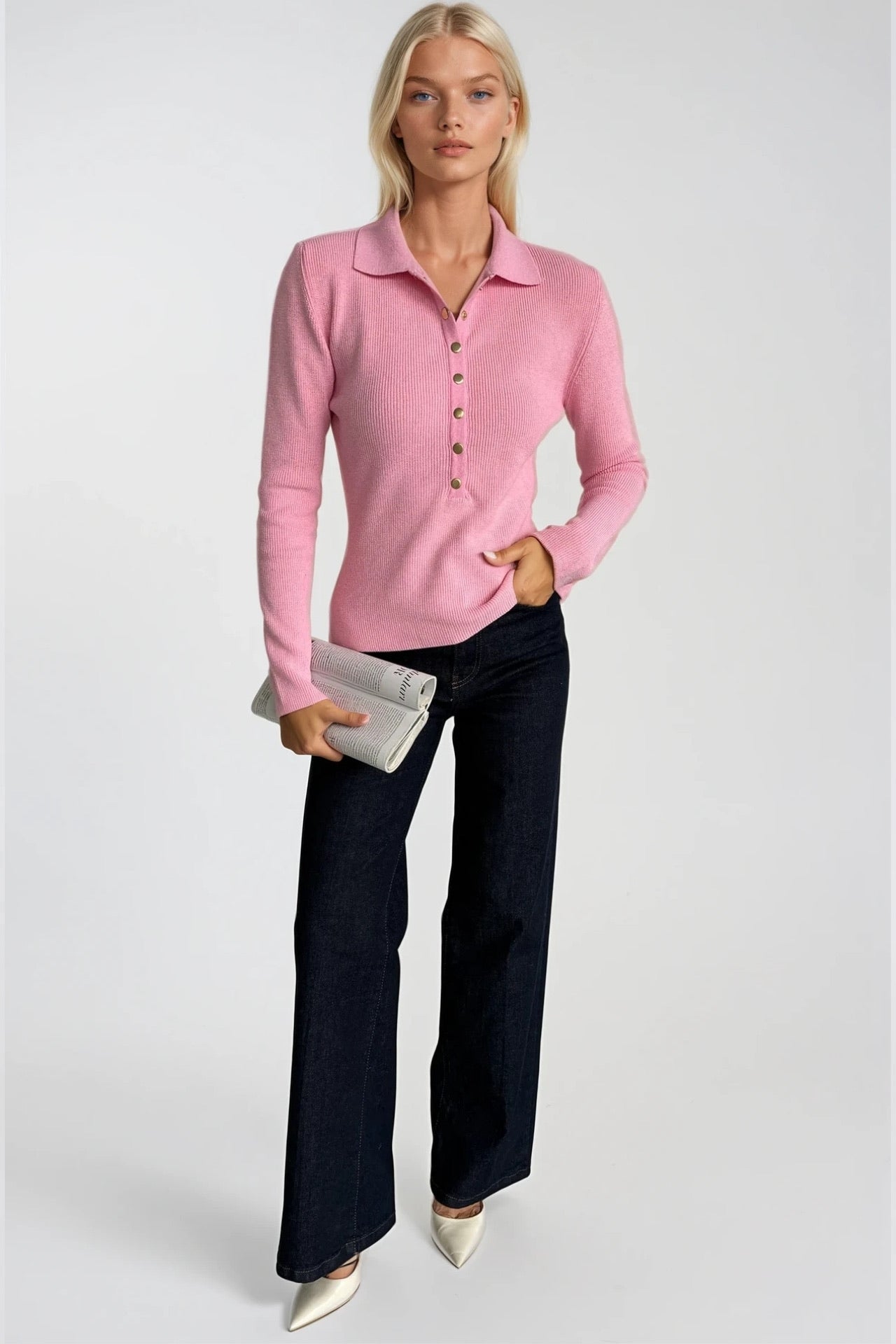Çıtçıt Detay Polo Yaka Pembe Triko Bluz