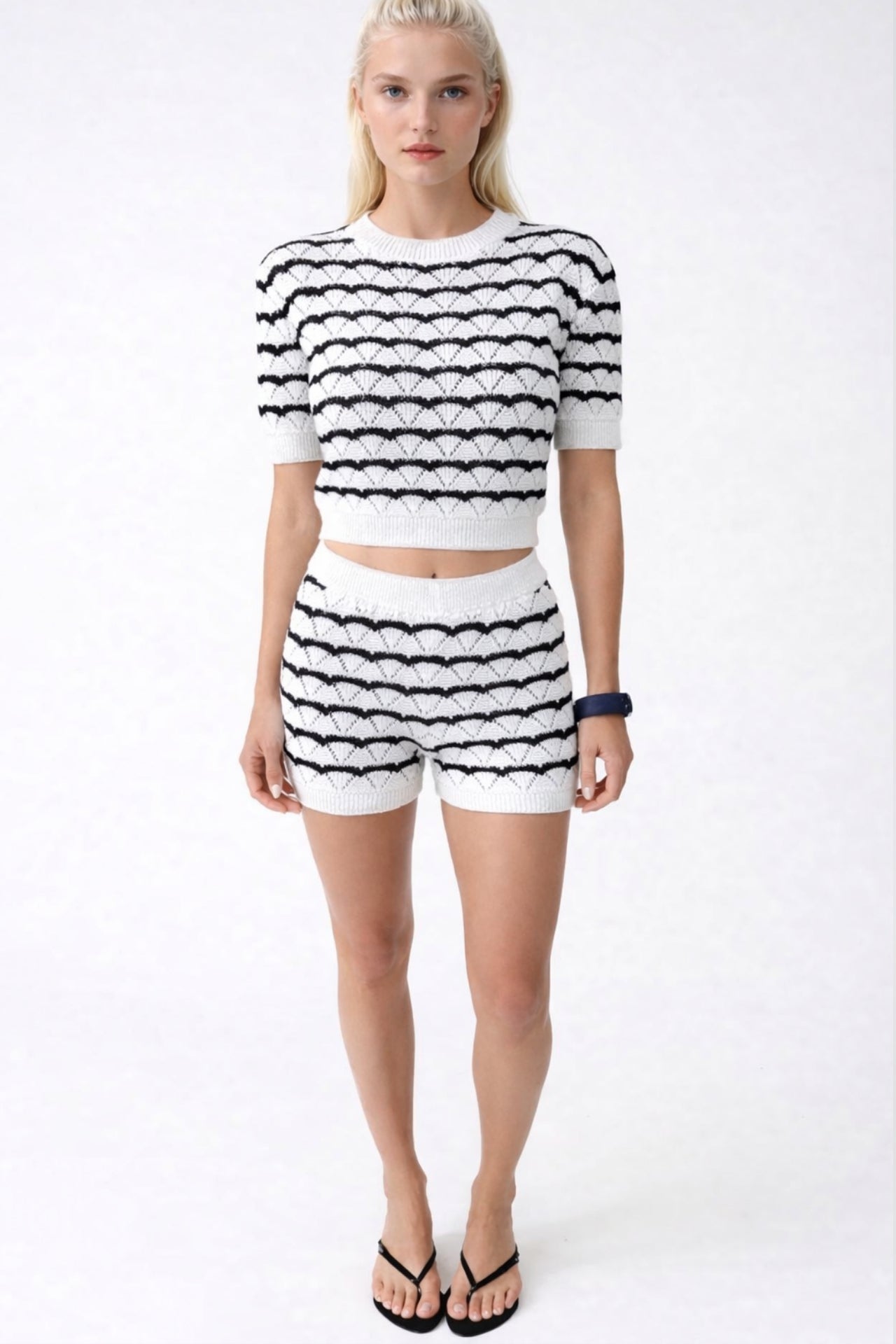 Çizgili Ajurlu Bluz Şort Siyah-Beyaz İkili Takım