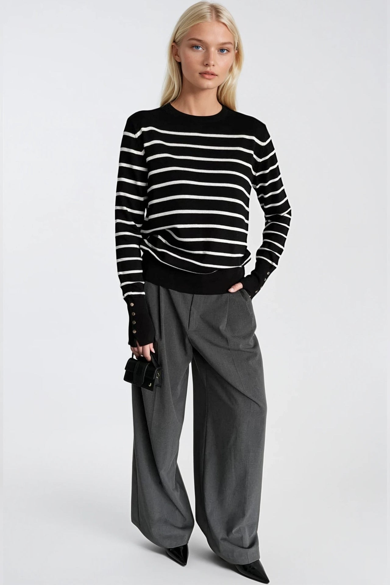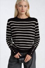 Çizgili Bisiklet Yaka Düğme Detay Siyah Triko Bluz