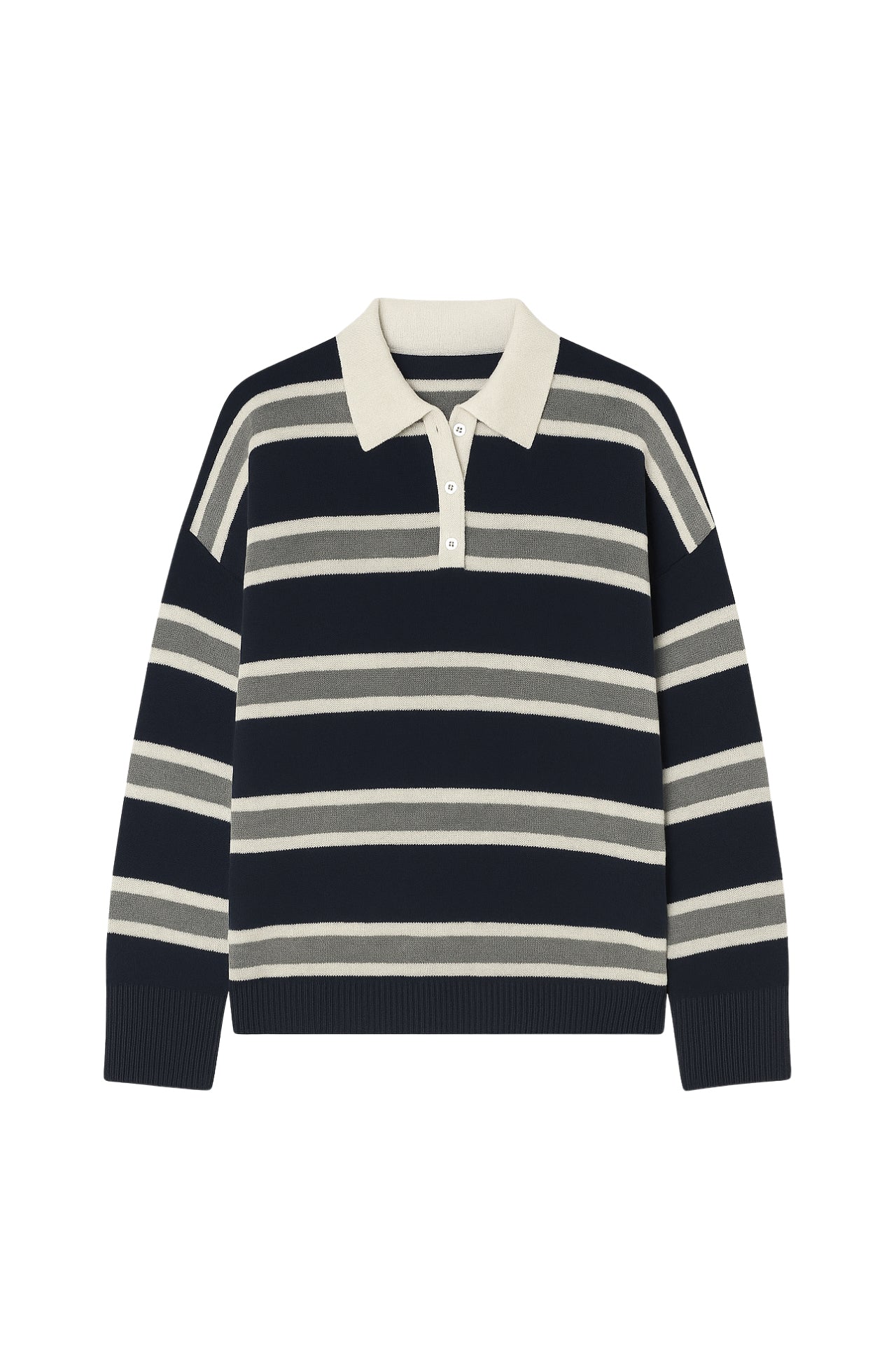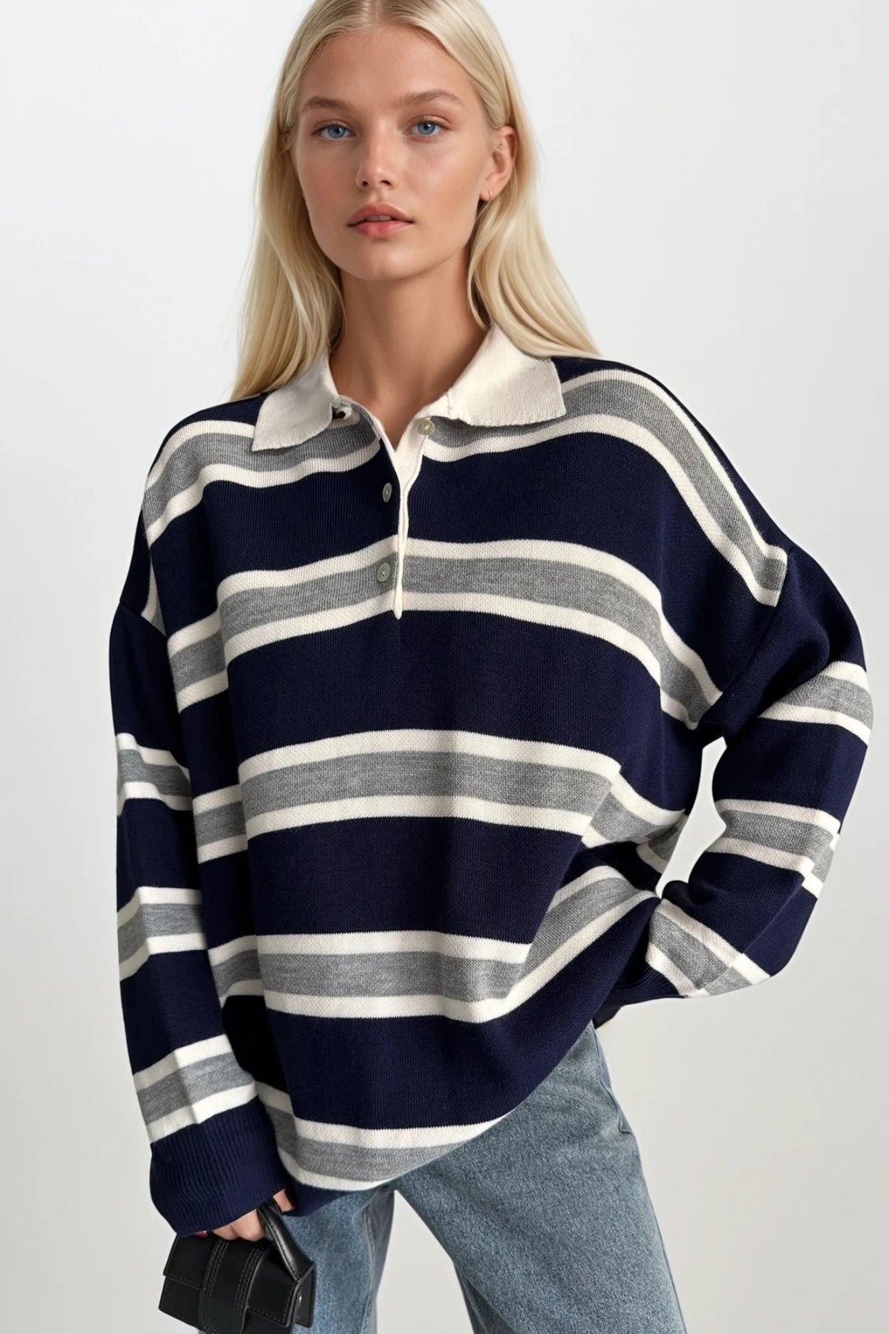 Çizgili Düğmeli Polo Yaka Lacivert Triko Bluz