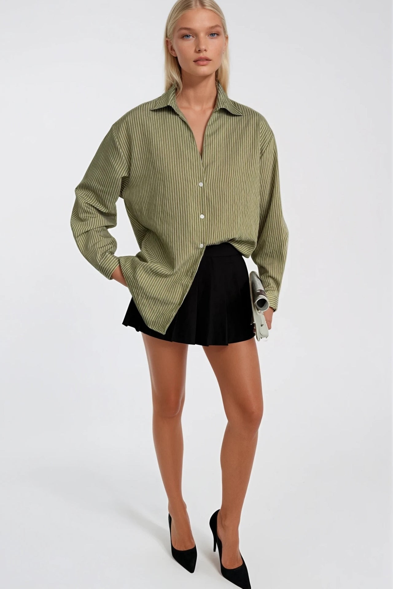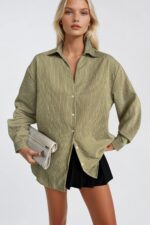 Çizgili Haki Oversize Gömlek