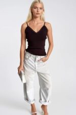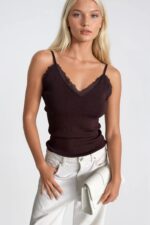 Dantel Detay Askılı Kahverengi Triko Bluz