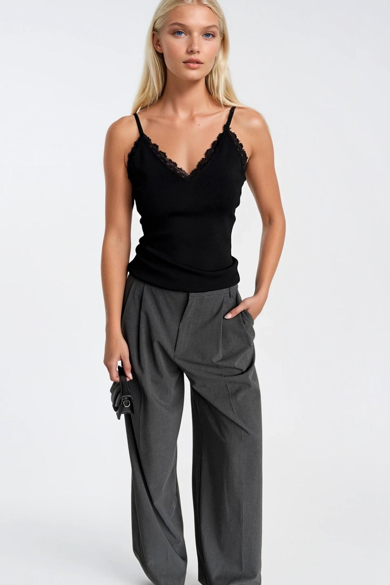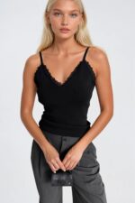 Dantel Detay Askılı Siyah Triko Bluz