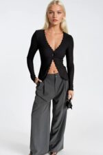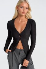 Dantel Detay Düğmeli Siyah Fitilli Bluz