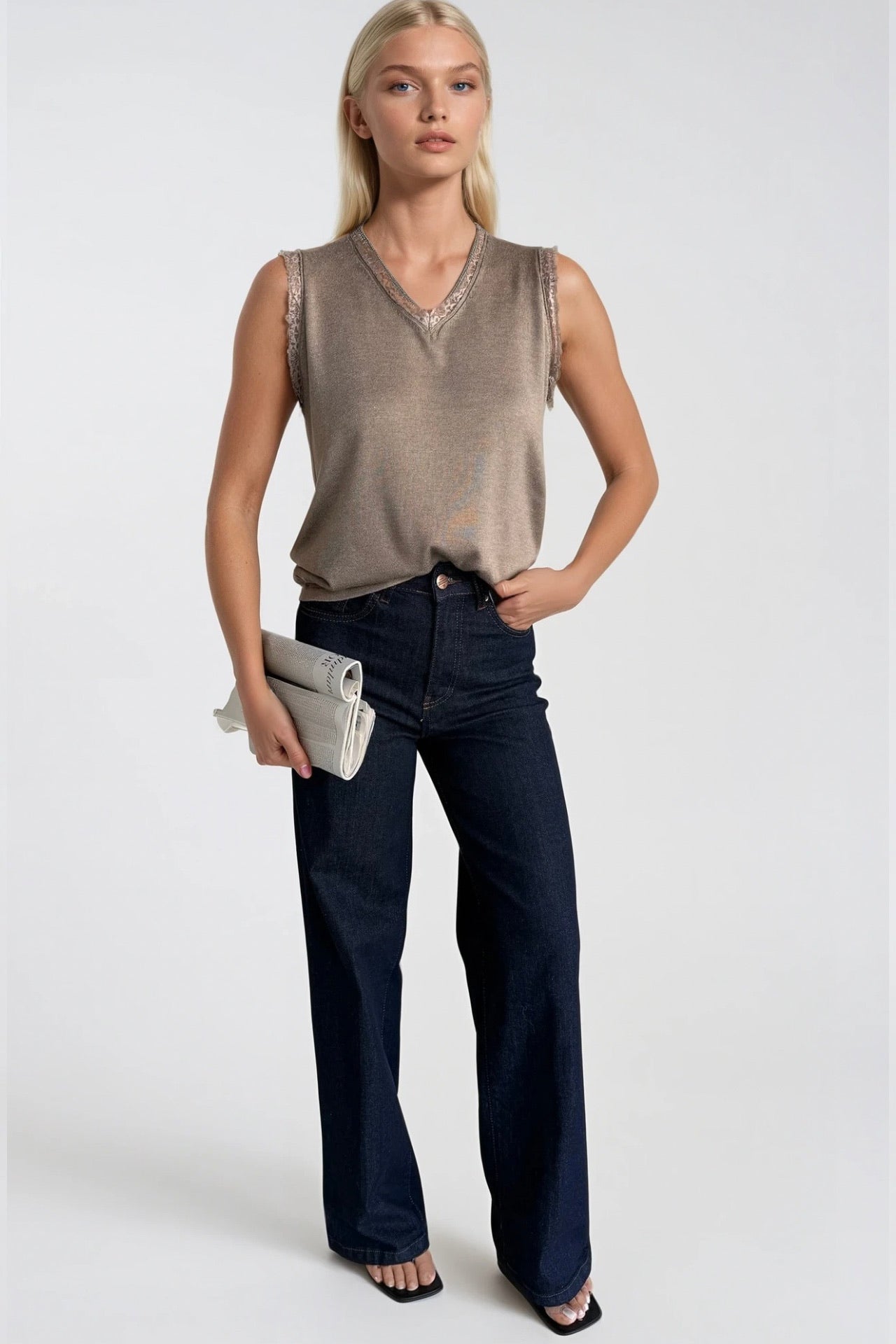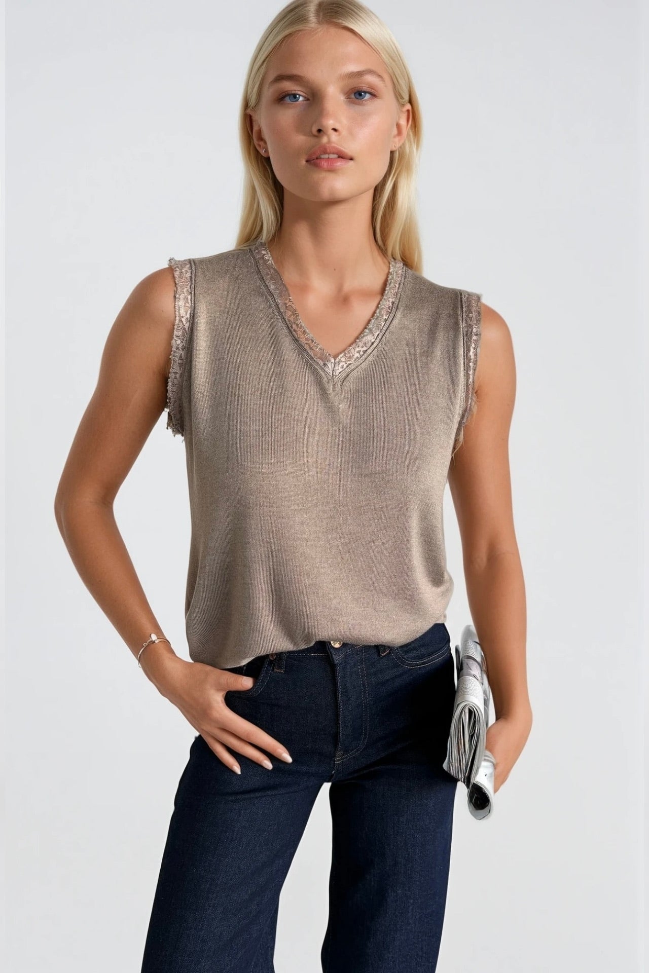 Dantel Detay Kolsuz Vizon Triko Bluz