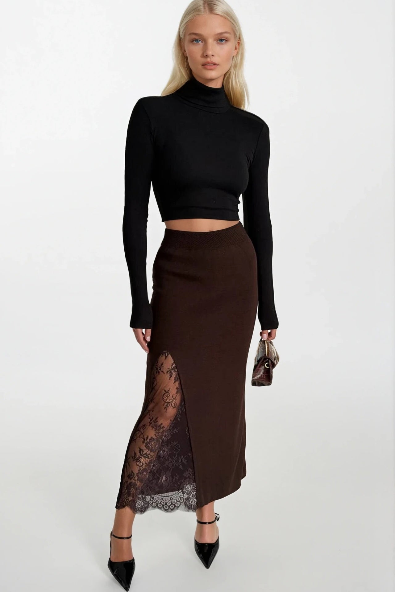 Dantel Detay Maxi Boy Kahverengi Triko Etek