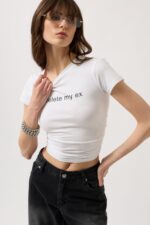 Delete My Ex Baskılı Likralı Crop Beyaz T-Shirt