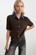Denim Yaka Gold Düğmeli Yarım Kol Kahverengi Triko Bluz