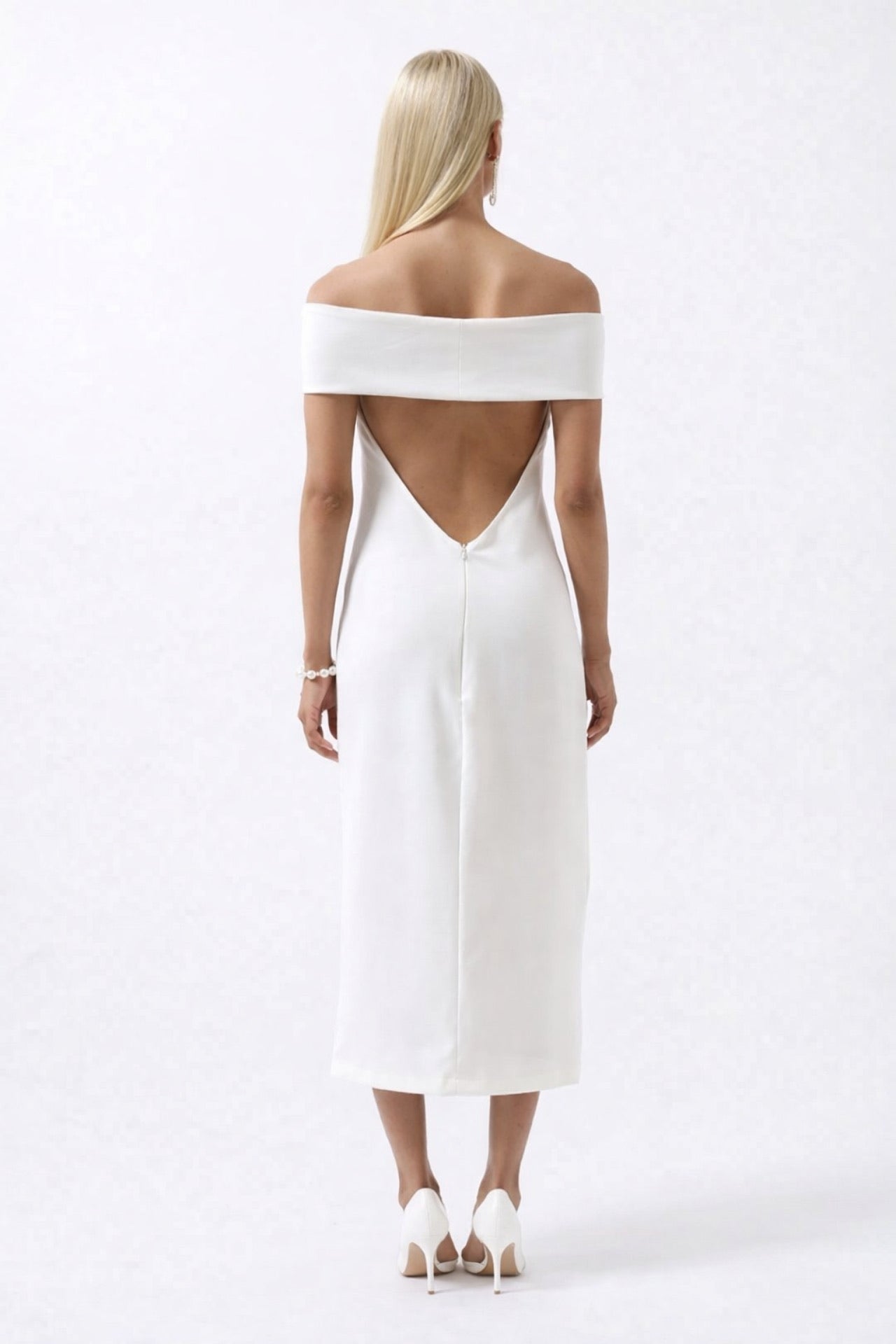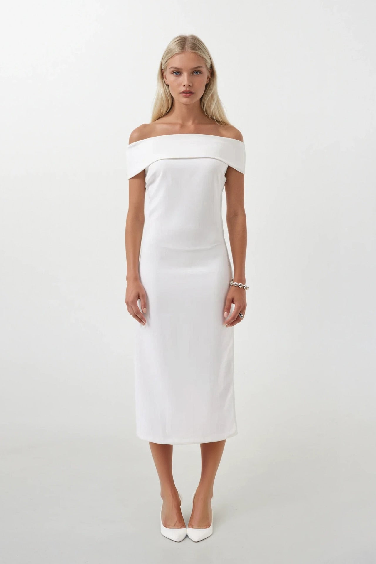 Rrip i dyfishtë me shpatulla të vetme, dekolte barku, pamje asimetrike, thurje trikotazhesh, gjatësi midi, përshtatje e hollë, fustan me