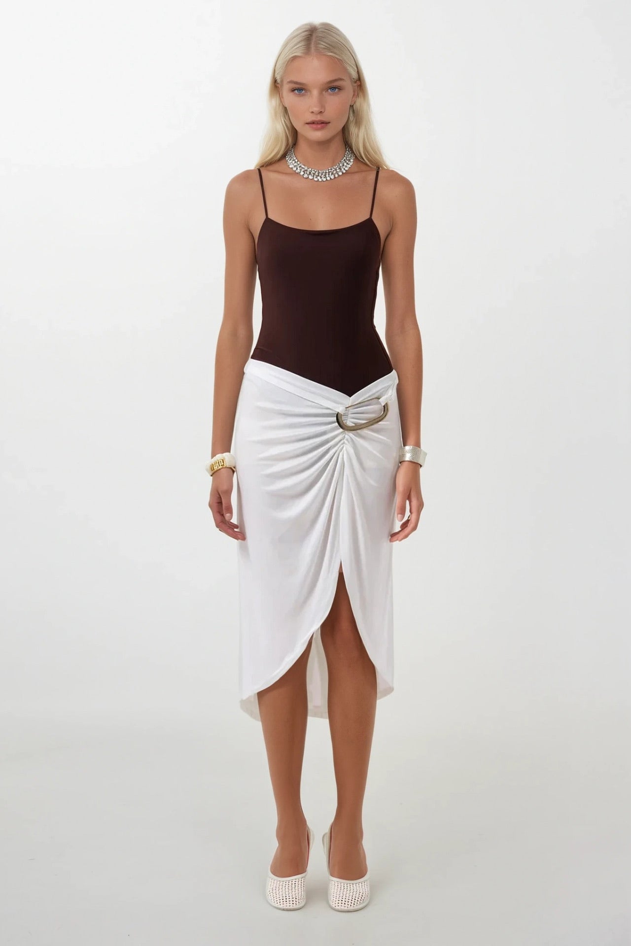 Kopsa e detajuar, e çarë e thellë, pëlhurë likre, bel i ulët, gjatësia midi, pamje asimetrike fundi Modeli i modelit: Gjoks: 89 cm Beli: 68 cm Ijet: 95 cm Lartësia e manekinit: 177 cm Pesha: 57 kg Është madhësia M në manekin. Përmbajtja e produktit: 95 Polyester 5 Elestan Kodi i produktit: 24S02017