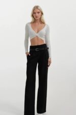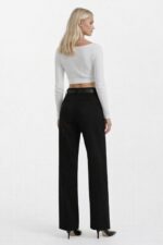 Pantallona me rrip, plisa dhe zinxhir, xhep i dyfishtë, me prerje të drejtë me bel të lartë Përmasat e modelit: Gjoks: 80 cm Beli: 62 cm Ijet: 88 cm Manekini Lartësia: 180 cm Pesha: 64 kg Është madhësia S në manekin. Përmbajtja e produktit: 95 Polyester 5 Elestan Kodi i produktit: 24S01001