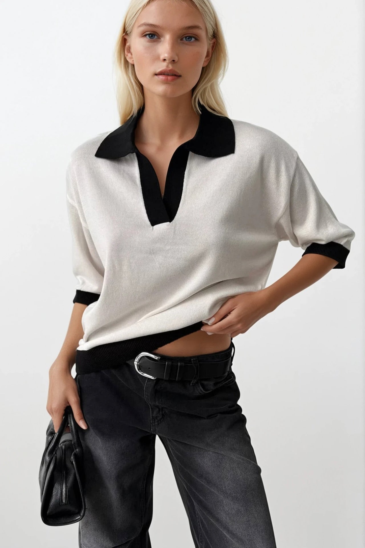Detaje me shirita me qafë V Bluzë e zezë e bardhë