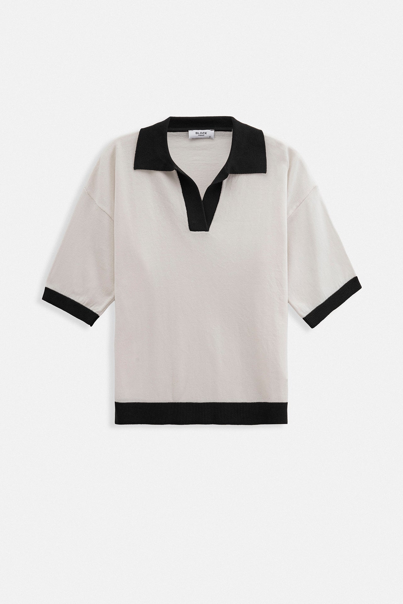 Pëlhurë pambuku, strukturë e butë, jakë dhe kontrast i mëngëve, modeli i bluzës së thurur: Gjoks: 81 cm Beli: 61 cm Ijet: 91 cm Lartësia e manekinit: 173 cm Pesha: 59 kg Është madhësia S në manekin. Përmbajtja e produktit: 100 poliestër Kodi i produktit: 52217030