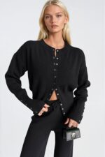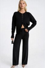 Düğme Detay Bel Oturtmalı Triko Bluz Pantolon Siyah İkili Takım