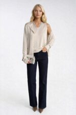 Ashensor me kordon tërheqës me një shpatull Bluzë e bardhë asimetrike