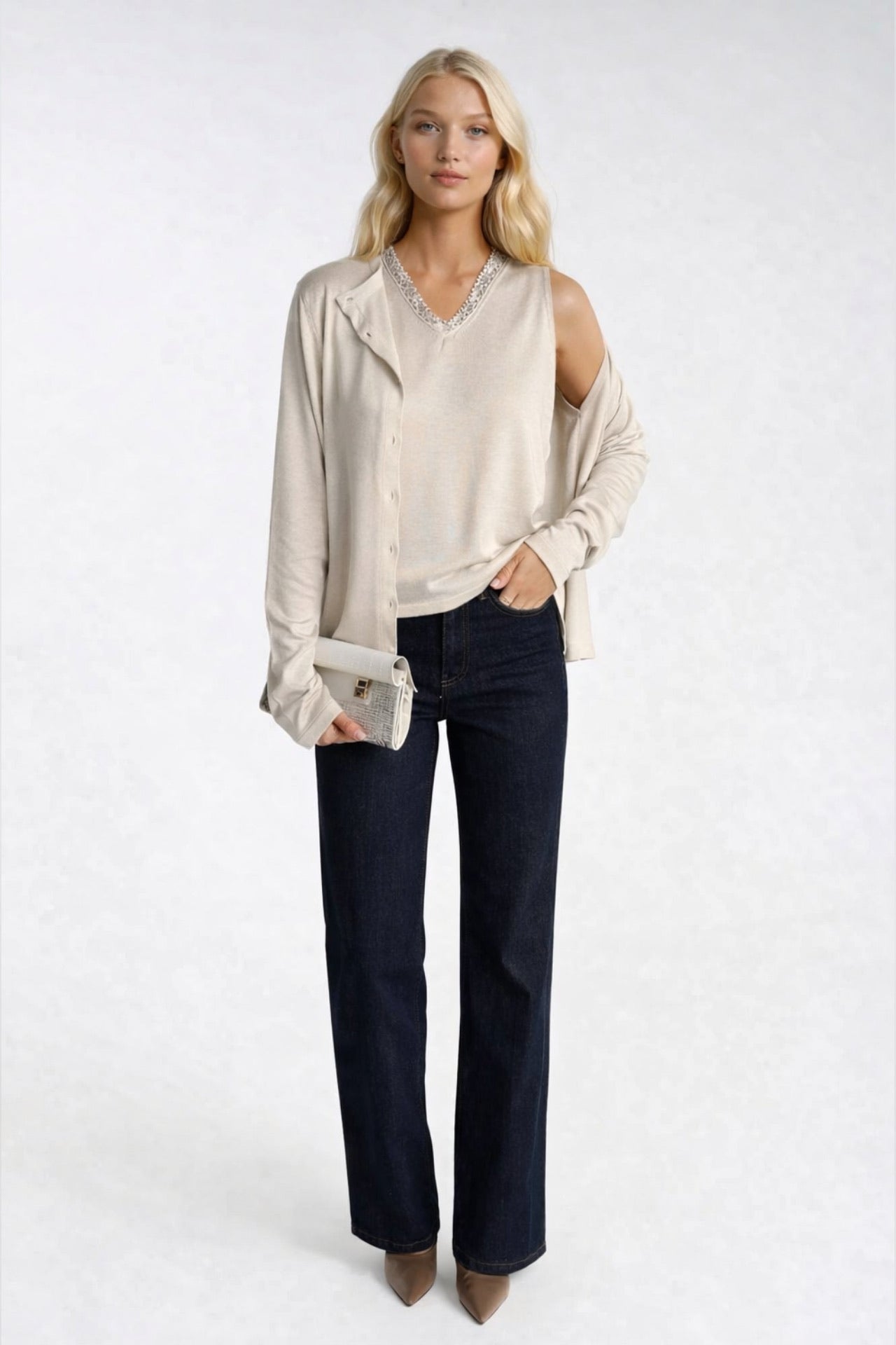 Düğme Detay İnce Bluz V Yaka Dantel Bluz İkli Bej Triko Takım