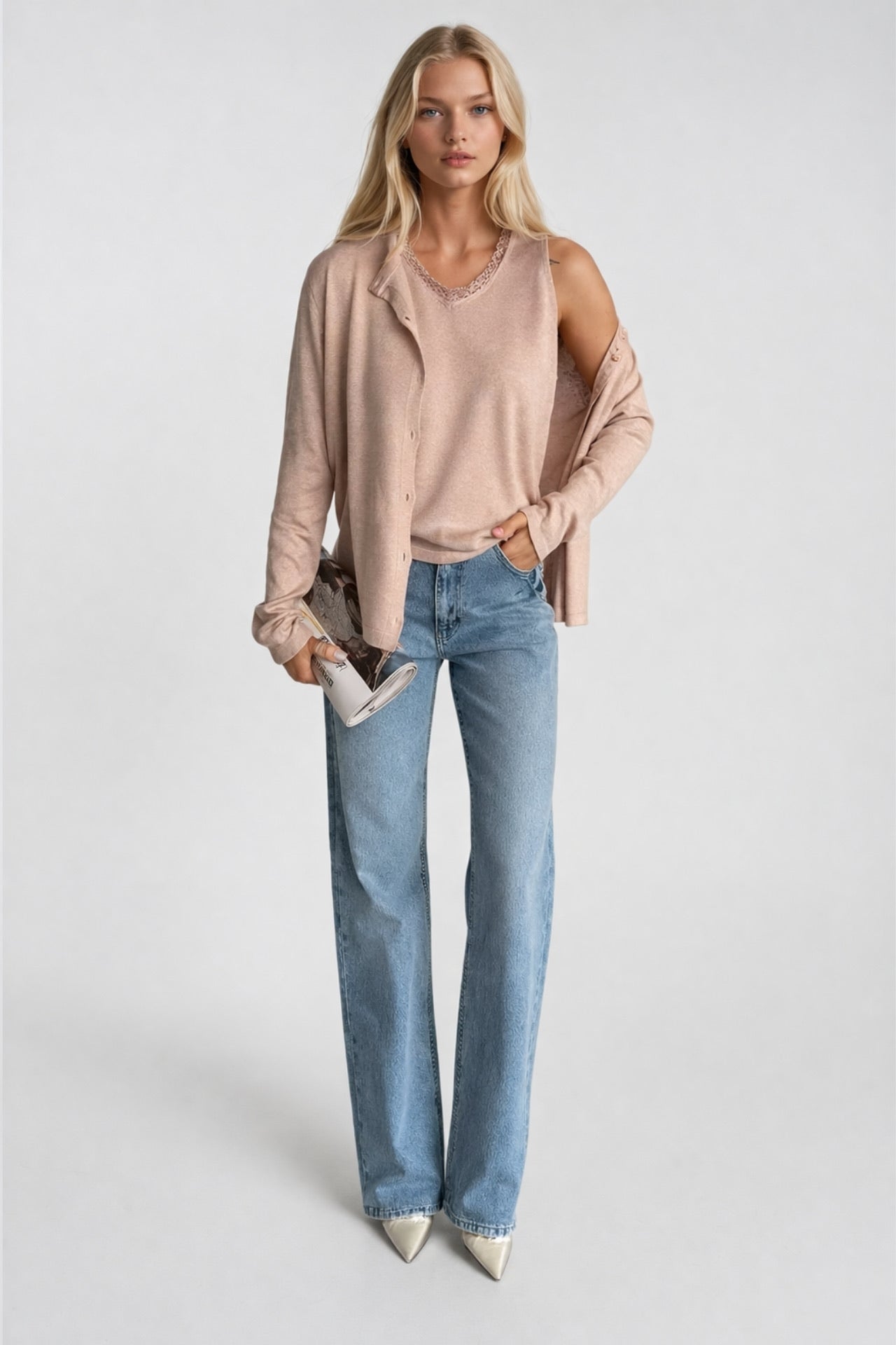 Düğme Detay İnce Bluz V Yaka Dantel Bluz İkli Pembe Triko Takım