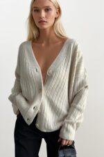 Düğme Detay Ekru Dokulu Triko Hırka