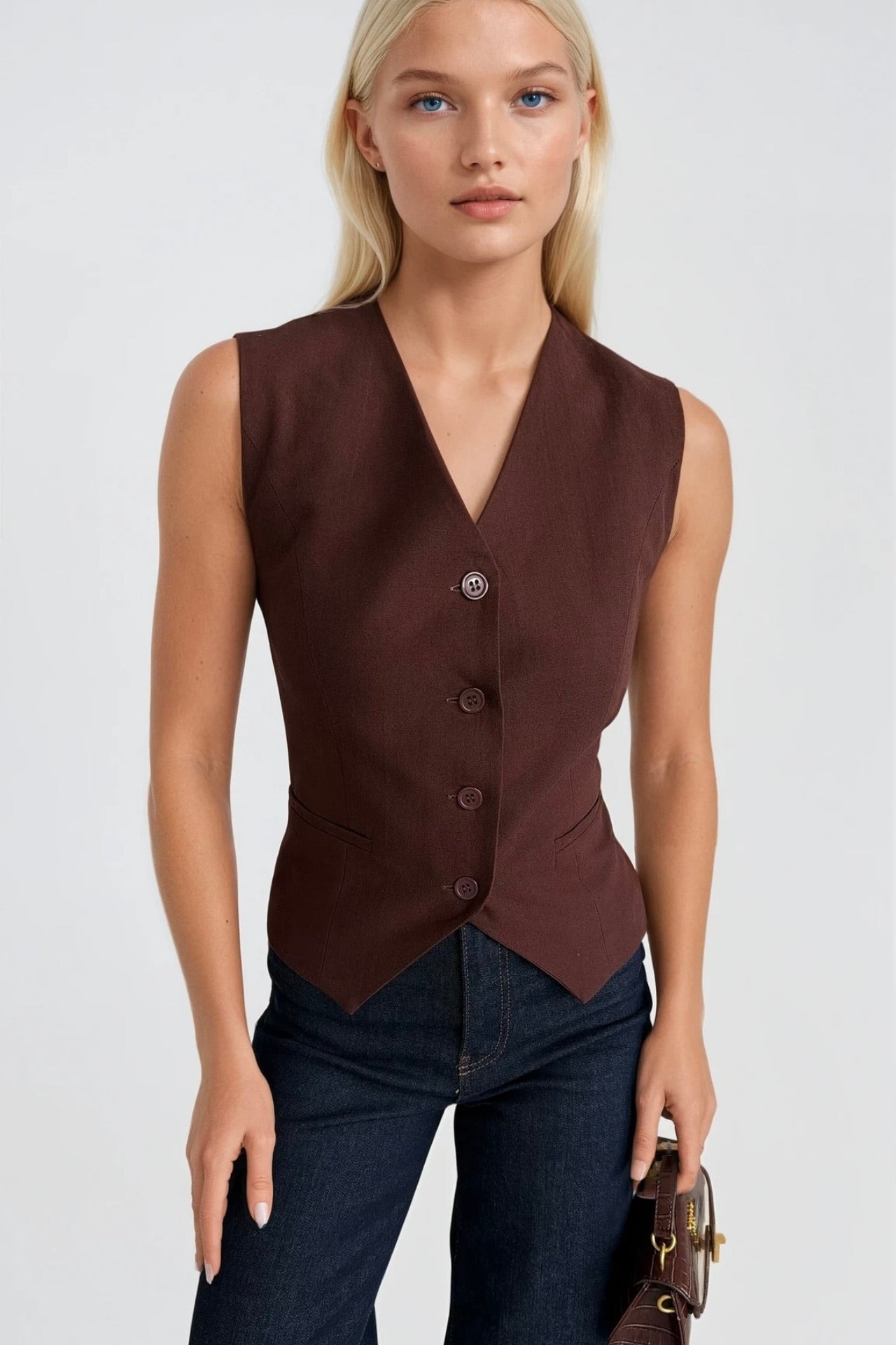 V-qafë, shpina me prerje të ulët, e gjatë, fiksimi i vetëm në pjesën e përparme, jelek, bluzë Dimensionet e modelit: